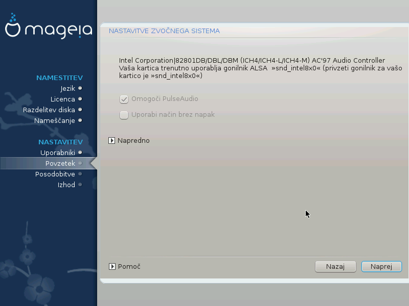 The default driver should work without problems. However, if after install you do encounter problems, then run draksound or start this tool via MCC (Mageia Control Center), by choosing the Hardware tab and clicking on Sound Configuration at the top right of the screen.