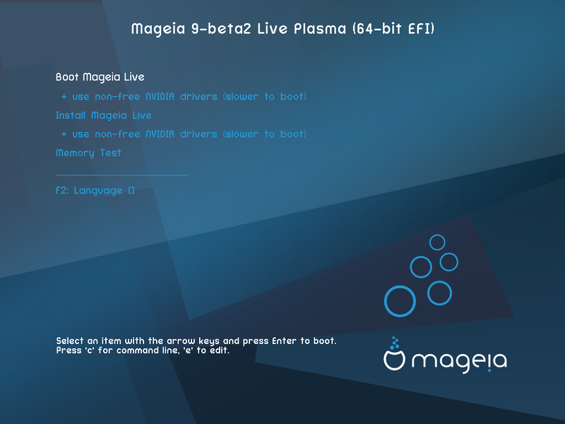 Ky opsion do të nisë sistemin Mageia Live nga mënyrat e lidhura DVD/USB (prisni një sistem shumë të ngadaltë në krahasim me një SO të instaluar).