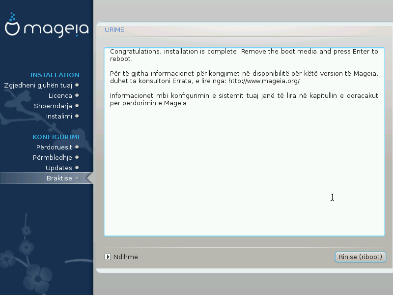 Ju keni përfunduar instalimin dhe konfigurimin e Mageia dhe tani është e sigurt për të hequr medium e instalimit dhe rifilloni kompjuterin tuaj.