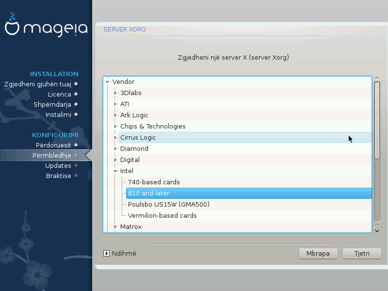 Nëse instaluesi nuk ka zbuluar kartën tuaj grafike të saktë dhe ju e dini cilën keni, ju mund të zgjidhni atë nga pema nga: