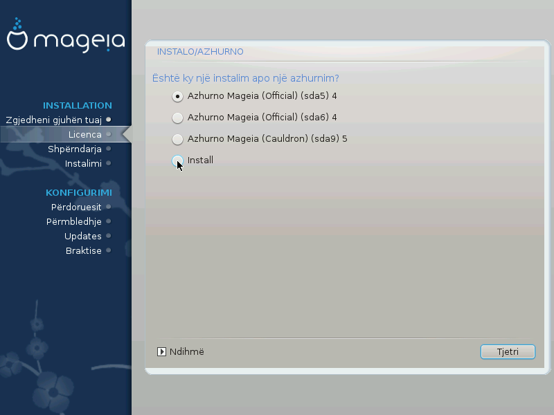 Përdoreni këtë alternativë për të kryer një instalim të ri të Mageia. Kjo do të formatojë ndarjet