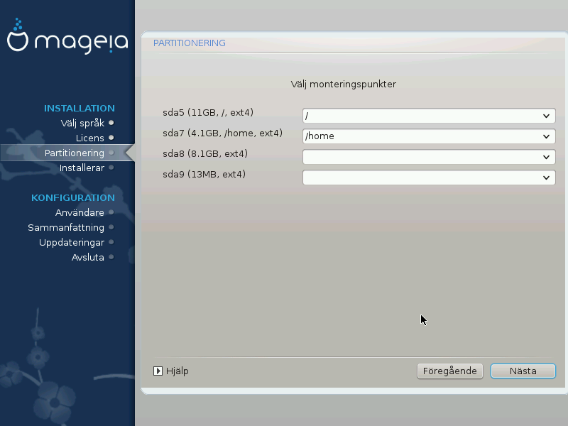 Här kan du se Linux- partitionerna som har upptäckts i din dator. Om du inte håller med om förslagen från DrakX så kan du ändra monteringspunkterna själv.