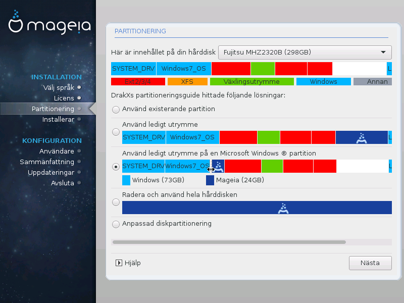 Om du har ledigt utrymme på din hårddisk kommer det här alternativet att använda det för att installera Mageia.