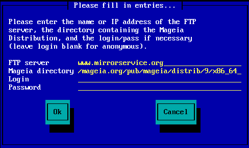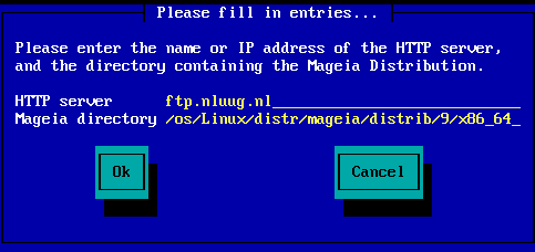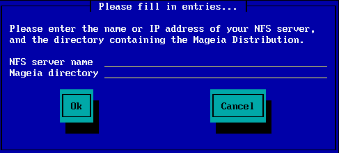 If you are using NFS, you will be asked for the NFS server name and the directory containing the Mageia distribution: