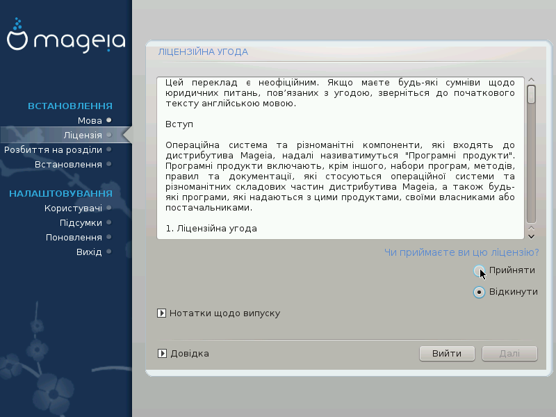Ці умови ліцензування стосуються всього дистрибутива Mageia. Вам слід прийняти ці умови, інакше встановлення буде неможливим.