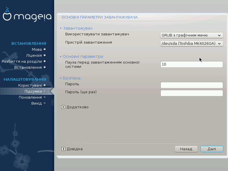 Якщо на комп’ютері вже встановлено інші операційні системи, Mageia спробує додати ці системи до вашого нового меню завантаження Mageia. Якщо вам це не потрібно, зніміть позначку з пункту Зондування сторонньої ОС.