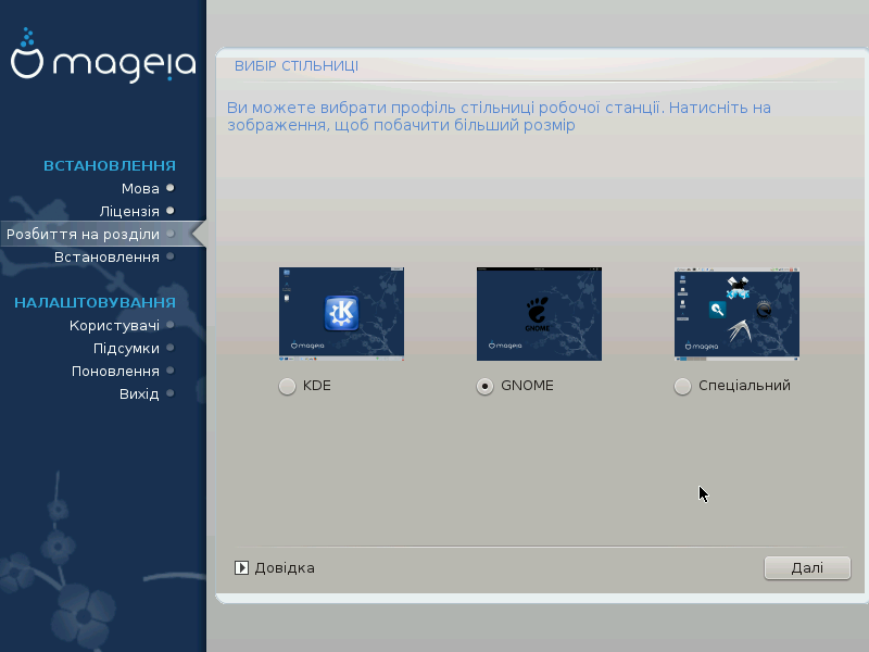 Виберіть бажаний варіант стільничного середовища: Плазму KDE або GNOME. Обидва середовища містять повний набір корисних програм та програмних інструментів.