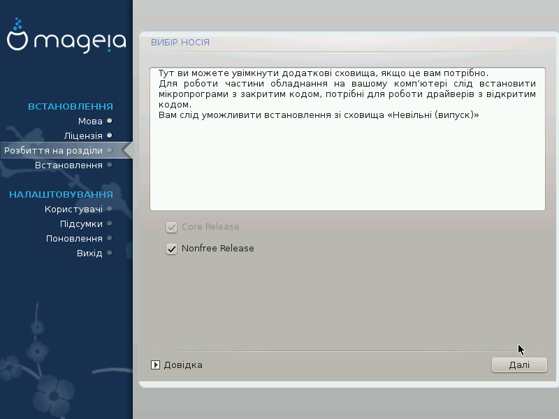 Тут ви побачите список доступних сховищ. Не всі сховища є доступними. Список доступних сховищ залежить від носія, яким ви скористалися для встановлення. Набір сховищ визначає, які з пакунків будуть доступними для вибору на наступних кроках.