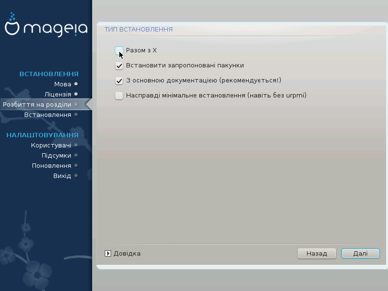 Ви можете вибрати «Мінімальне встановлення» зняттям позначок з усіх пунктів у списку вибору груп пакунків, див. розділ Вибір груп пакунків.
